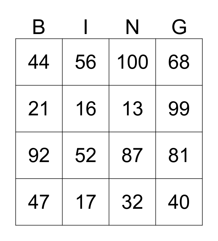 This bingo card has 16 words: 17, 81, 100, 44, 92, 56, 87, 32, 21, 16, 47, 68, 52, 99, 13 and 40.