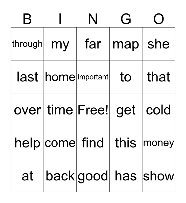 This bingo card has a free space and 29 words: at, him, time, warm, through, far, home, come, get, back, cold, show, good, has, that, on, find, help, she, over, this, from, to, last, map, my, money, important and call.