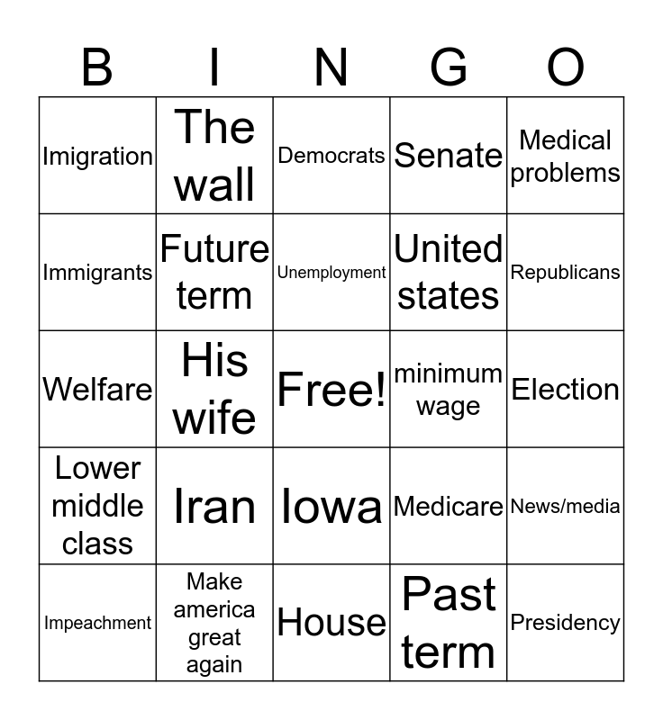 This bingo card has a free space and 24 words: Iran, Make america great again, Unemployment, Impeachment, Medical problems, Imigration, Immigrants, The wall, minimum wage, Iowa, United states, Welfare, Medicare, News/media, Future term, Past term, Election, Democrats, Republicans, His wife, Presidency, Lower middle class, Senate and House.