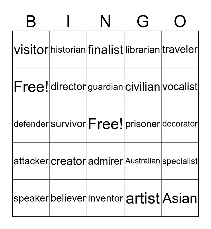 This bingo card has a free space and 24 words: speaker, creator, guardian, artist, traveler, visitor, historian, finalist, prisoner, decorator, defender, director, Australian, specialist, Free!, believer, inventor, librarian, vocalist, attacker, survivor, admirer, civilian and Asian.