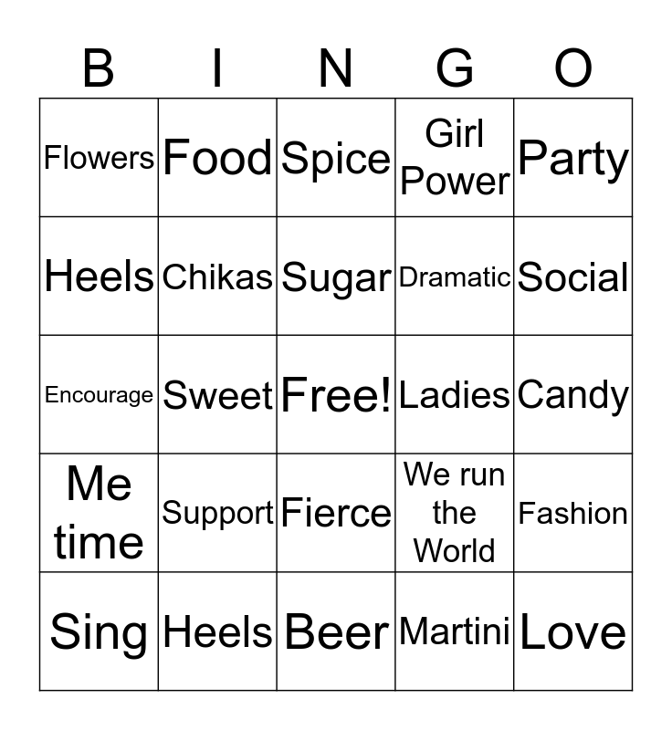 This bingo card has a free space and 34 words: Margaritas, Martini, Venting, Boys Drool, Me time, Chikas, Party, Sing, Food, Wine, Sugar, Spice, Glitter, Sas, Ladies, Social, Heels, Encourage, Support, We run the World, Fierce, Brunch, Flowers, Candy, Beer, Love, Girl Power, Ladies Night, Dramatic, Heels, La Chancla, Sweet, Fashion and More WINE!.