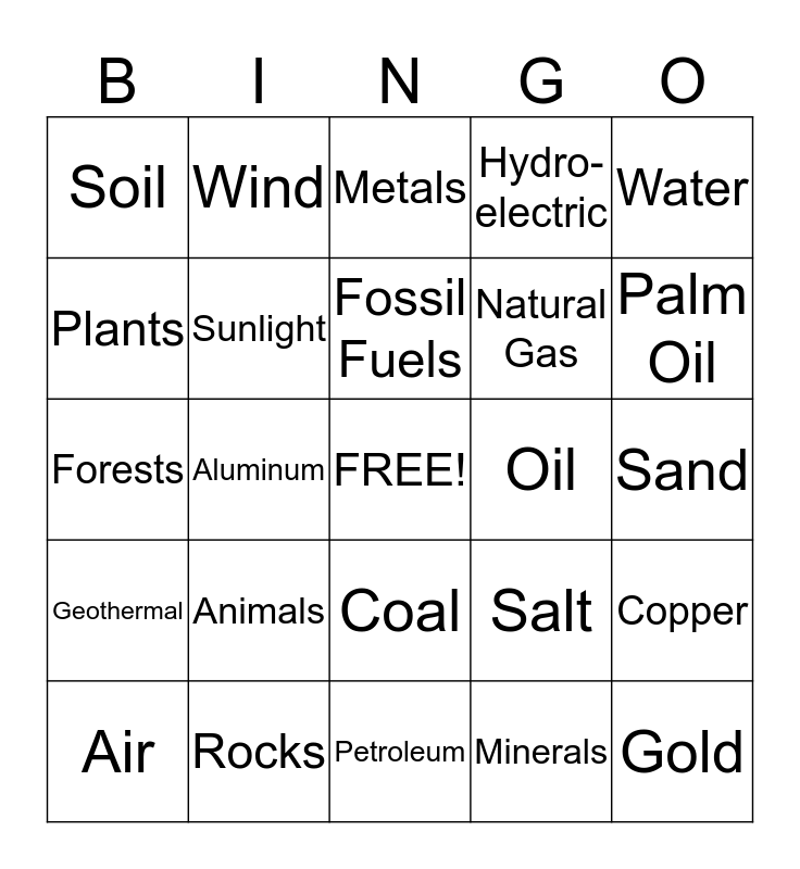 This bingo card has a free space and 24 words: Animals, Rocks, Fossil Fuels, Air, Water, Soil, Plants, Wind, Oil, Coal, Natural Gas, Forests, Salt, Copper, Sunlight, Minerals, Sand, Metals, Palm Oil, Aluminum, Gold, Geothermal, Hydro-electric and Petroleum.