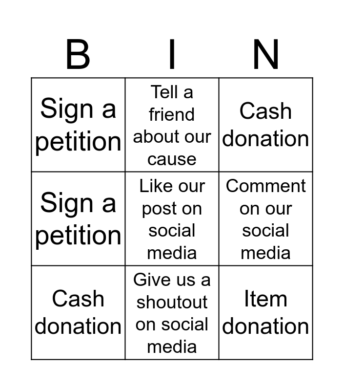 This bingo card has a free space and 12 words: Sign a petition, Share our post to other person, Item donation, Comment on our social media, Tell a friend about our cause, Cash donation, Give us a shoutout on social media, Cash donation, Sign a petition, Sign a petition, Cash donation and Cash donation.
