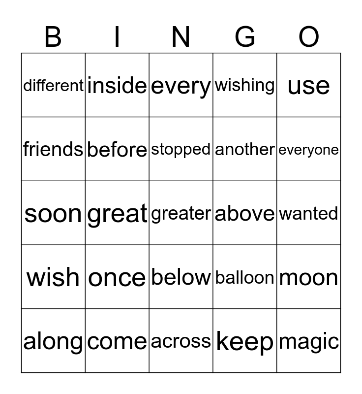 This bingo card has 25 words: once, across, stopped, along, use, different, friends, inside, above, below, another, soon, balloon, moon, before, magic, wanted, every, everyone, great, greater, come, wish, wishing and keep.