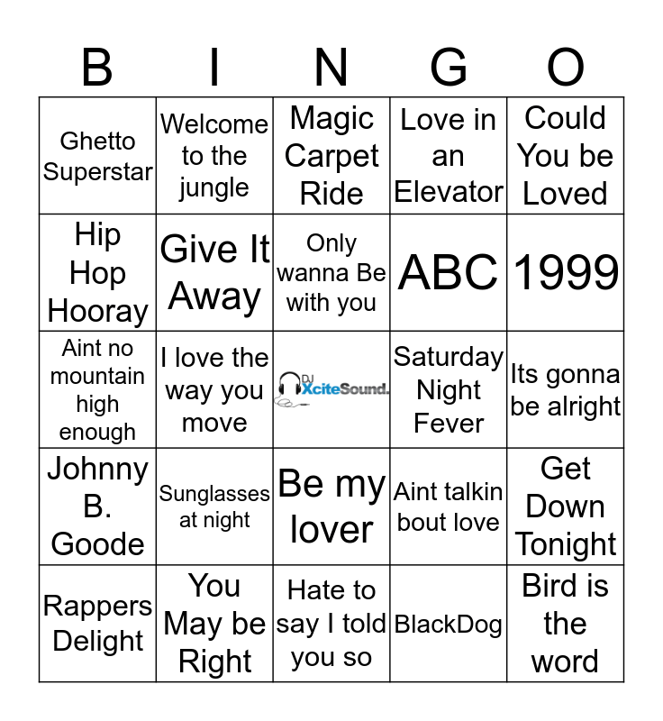 This bingo card has a free space and 59 words: Centerfield, You May be Right, Ain’t No Rest for the Wicked, Johnny B. Goode, BlackDog, Land of 1000 Dances, Give It Away, Roadhouse Blues, ABC, All That She Wants, Love in an Elevator, Father of Mine, Hip Hop Hooray, Sexual Healing, Superstitious, Ghetto Superstar, Bird is the word, Could You be Loved, Tubthumping, Only wanna Be with you, Saturday Night Fever, Magic Carpet Ride, Rappers Delight, Get Down Tonight, Gonna Make You Sweat, Pink Houses, Lets Dance, I want to dance with somebody, 1999, Short skirt / Long Jacket, Gimme All your lovin, Show me love, Electric avenue, Groove is in the heart, Welcome to the jungle, Cant get enough of you baby, September, I love the way you move, You spin me right around, Aint no mountain high enough, Dance to the music, Sunglasses at night, Its gonna be alright, Everybody have fun tonight, Taking care of business, Im gonna be, Believe, Uptight, Be my lover, Hate to say I told you so, Bad girlfriend, Jumpin Jack Flash, Anyway you want it, Somebody told Me, Lips are Movin, Aint talkin bout love, Little lion man, Shout and To be With You.