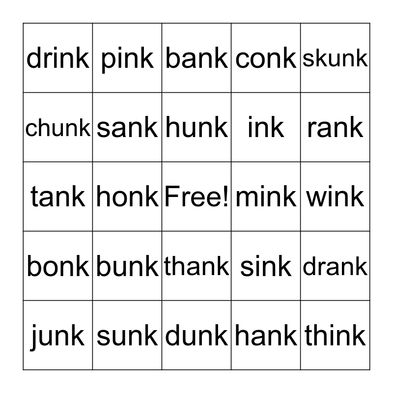 This bingo card has a free space and 24 words: bunk, sunk, hunk, junk, skunk, drink, chunk, pink, mink, thank, ink, tank, sink, drank, sank, hank, wink, bank, rank, honk, think, bonk, conk and dunk.