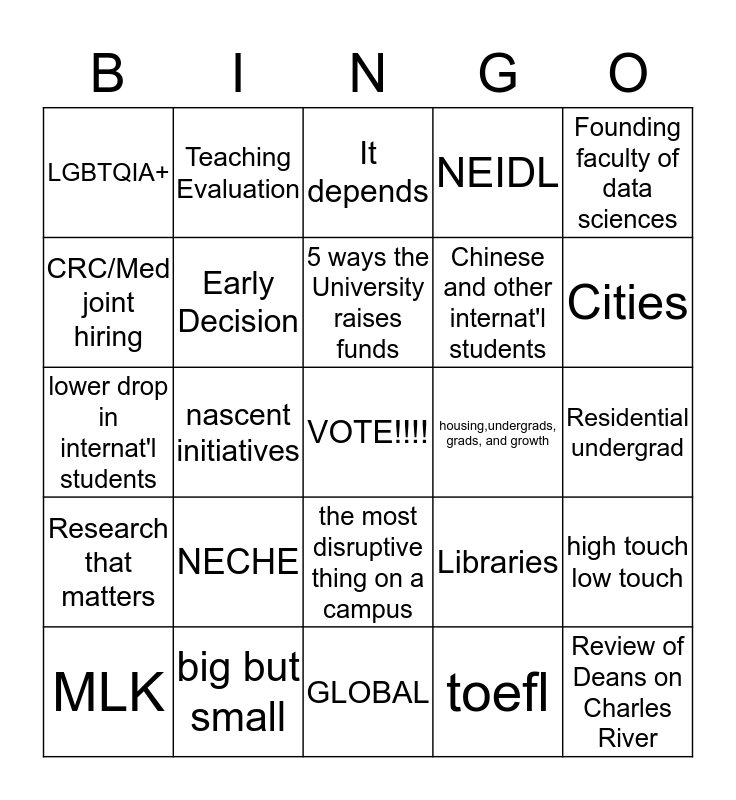 This bingo card has a free space and 40 words: Who determines searches (approval), lower drop in internat'l students, New Degrees Approved, Early Decision, big but small, the most disruptive thing on a campus, 5 ways the University raises funds, online mba, Founding faculty of data sciences, Research that matters, nascent initiatives, NEIDL, Review of Deans on Charles River, Residential undergrad, housing,undergrads, grads, and growth, NECHE, free speech, LGBTQIA+, Philan-thropy, It depends, high touch low touch, toefl, Chinese and other internat'l students, CRC/Med joint hiring, Vibrant academic experience, diversity, equity, inclusion, input on the plan, conflict of commit-ment and research, financial aid rates, Student Wellness... how much support?, Sustain- ability, MLK, Howard Thurman, Libraries, Cities, GLOBAL, grow Masters/ Prof'l programs, Sue Kennedy, Teaching Evaluation and Who sets targets?.