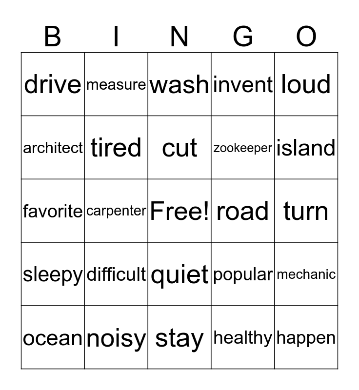 This bingo card has a free space and 34 words: health, healthy, rest, travel, sleepy, tired, loud, ocean, measure, slice, cut, wash, village, country, road, island, noisy, favorite, difficult, popular, quiet, follow, drive, turn, stay, happen, invent, change, zookeeper, architect, fire, carpenter, mechanic and nurse.