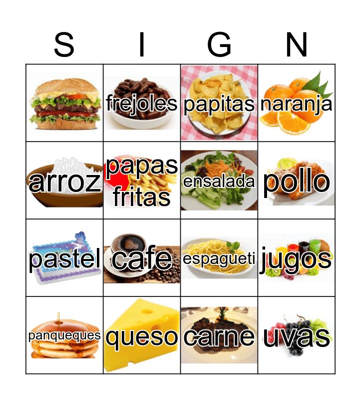 This bingo card has 35 images and 34 words: zanahoria, platano, panecillo, uvas, panqueques, queso, papitas, leche, manzana, carne, jugos, gratis, cafe, ensalada, naranja, fresa, tomate, perro caliente, pollo, pastel, helado, agua, tostada, frejoles, espagueti, pan, arroz, papas fritas, cereal, sandia, pastel de manzana, durazno, pina and huevo.