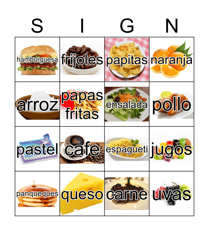 This bingo card has 35 images and 36 words: zanahoria, platano, panecillo, uvas, panqueques, queso, papitas, leche, hamburguesa, manzana, carne, jugos, gratis, cafe, ensalada, naranja, fresa, tomate, perro caliente, pollo, pastel, helado, agua, tostada, tocino, frijoles, espagueti, pan, arroz, papas fritas, cereal, sandia, pastel de manzana, durazno, pina and huevo.