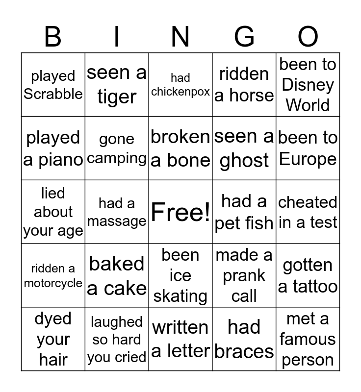 This bingo card has a free space and 24 words: dyed your hair, baked a cake, broken a bone, had braces, been to Disney World, played Scrabble, seen a tiger, had chickenpox, had a pet fish, cheated in a test, lied about your age, gone camping, made a prank call, gotten a tattoo, played a piano, laughed so hard you cried, written a letter, ridden a horse, been to Europe, ridden a motorcycle, had a massage, been ice skating, seen a ghost and met a famous person.