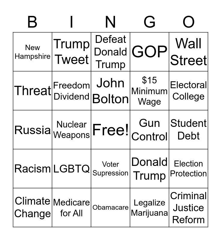 This bingo card has a free space and 45 words: Bernie, Medicare for All, Fox News, Donald Trump, Iowa Caucus, Climate Change, Freedom Dividend, Fake News, GOP, Criminal Justice Reform, New Hampshire, Socialist, Gun Control, Student Debt, Green New Deal, Immigration, Foreign Policy, $15 Minimum Wage, Ukraine, Russia, Trump Tweet, Speaker Pelosi, Legalize Marijuana, Wall Street, Abortion, DACA, Obamacare, President Obama, Election Protection, Racism, I have a plan for that, John Bolton, Revolution, Abolish ICE, Working Class Voter, LGBTQ, Voter Supression, Supreme Court, House Managers, Threat, Nuclear Weapons, Defeat Donald Trump, State of the Union, Electoral College and "I wrote the dam bill.".
