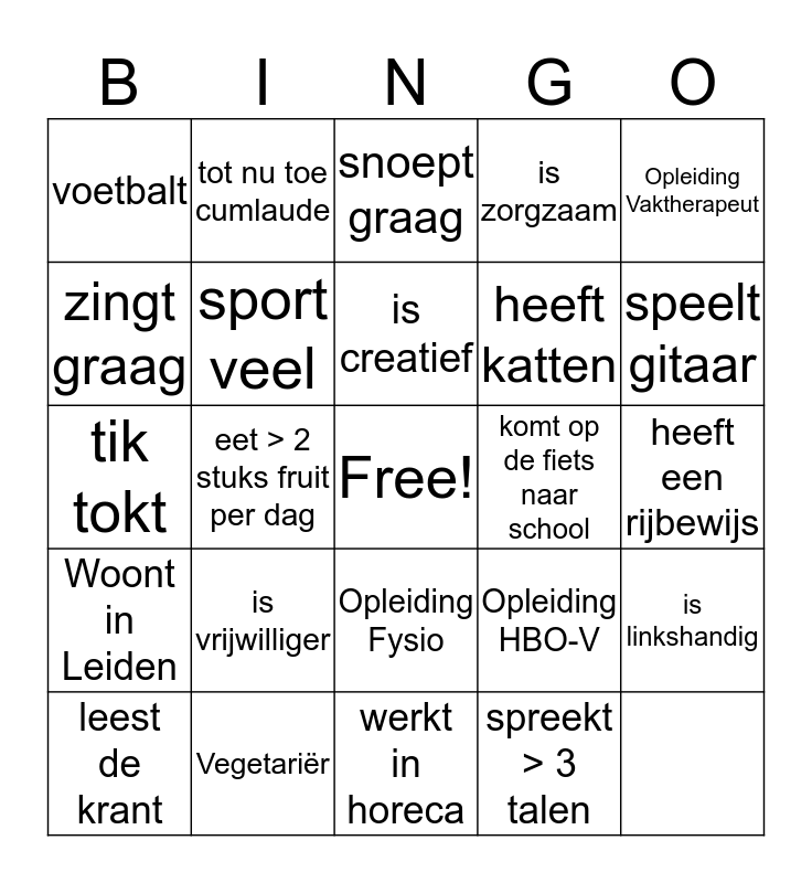 This bingo card has a free space and 24 words: Woont in Leiden, Vegetariër, Opleiding Fysio, Opleiding HBO-V, Opleiding Vaktherapeut, voetbalt, tot nu toe cumlaude, snoept graag, heeft katten, is linkshandig, zingt graag, sport veel, verslaafd aan telefoon, komt op de fiets naar school, speelt gitaar, leest de krant, eet > 2 stuks fruit per dag, is creatief, is zorgzaam, heeft een rijbewijs, tik tokt, is vrijwilliger, werkt in horeca and spreekt > 3 talen.