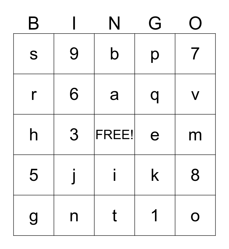 This bingo card has a free space and 32 words: 1, 2, 3, 4, 5, 6, 7, 8, 9, 10, a, b, c, d, e, f, g, h, i, j, k, l, m, n, o, p, q, r, s, t, u and v.