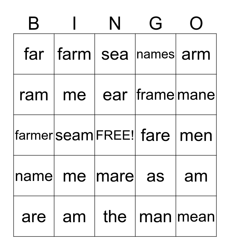 This bingo card has a free space and 24 words: me, am, ear, are, arm, far, ram, farm, fare, mare, frame, farmer, as, am, me, man, men, sea, mane, seam, mean, name, names and the.