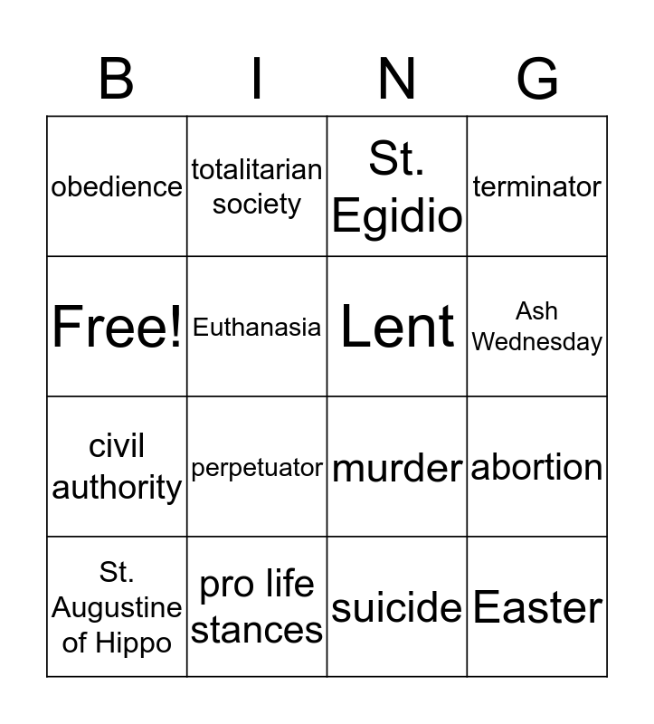 This bingo card has 16 words: pro life stances, abortion, St. Egidio, obedience, civil authority, totalitarian society, murder, suicide, Free!, Euthanasia, St. Augustine of Hippo, terminator, perpetuator, Ash Wednesday, Lent and Easter.