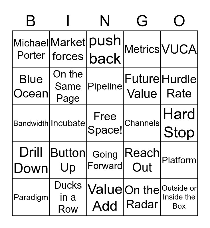 This bingo card has a free space and 24 words: Button Up, Ducks in a Row, Pipeline, Paradigm, VUCA, Michael Porter, Blue Ocean, Market forces, Channels, Going Forward, Future Value, Bandwidth, Reach Out, Platform, On the Same Page, On the Radar, Hard Stop, push back, Hurdle Rate, Incubate, Outside or Inside the Box, Drill Down, Metrics and Value Add.