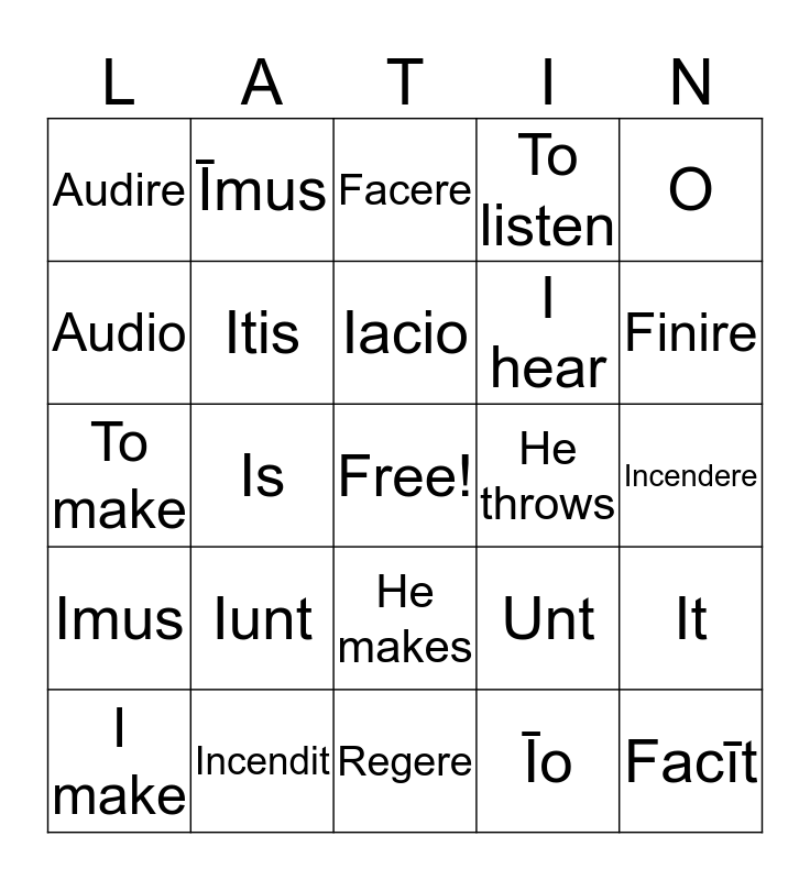 This bingo card has a free space and 32 words: Īo, Iō, Is, Īt, Imus, Itis, O, It, Īmus, Facio, Iacio, Facere, I throw, You throw, He throws, We throw, I make, To make, He makes, Iunt, Unt, Incendo, Incendere, Incendit, Facīt, To listen, I hear, Audio, Audire, Regere, Mitō and Finire.
