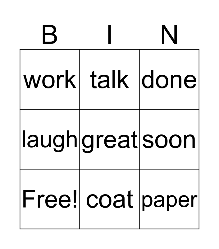 This bingo card has 9 words: Free!, done, talk, laugh, work, soon, great, paper and coat.