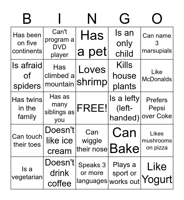 This bingo card has a free space and 24 words: Doesn't like ice cream, Doesn't drink coffee, Loves shrimp, Is a vegetarian, Can name 3 marsupials, Has been on five continents, Is afraid of spiders, Can't program a DVD player, Is a lefty (left-handed), Can wiggle their nose, Kills house plants, Has twins in the family, Can Bake, Likes mushrooms on pizza, Has climbed a mountain, Plays a sport or works out, Prefers Pepsi over Coke, Has a pet, Like McDonalds, Has as many siblings as you, Like Yogurt, Can touch their toes, Is an only child and Speaks 3 or more languages.