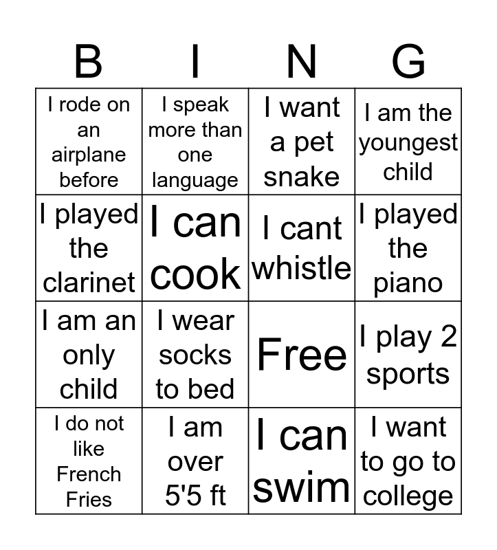 This bingo card has 20 words: I play 2 sports, I have won a trophy before, I want a pet snake, I am born outside the U.S, I do not like French Fries, I played the clarinet, I am over 5'5 ft, I rode on an airplane before, I am an only child, I speak more than one language, I wear socks to bed, Free, I can cook, I want to go to college, I cant whistle, I have been to another state, I played the piano, I am the youngest child, I can swim and I have bad handwriting.