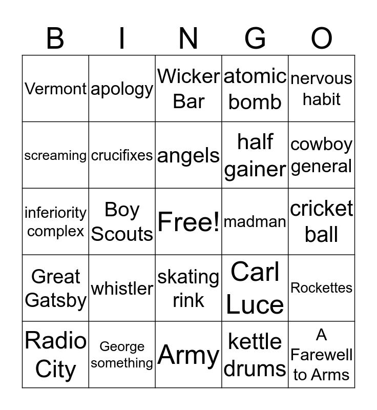 This bingo card has a free space and 24 words: whistler, George something, angels, Radio City, nervous habit, Vermont, screaming, apology, madman, skating rink, half gainer, inferiority complex, Carl Luce, Rockettes, crucifixes, kettle drums, cricket ball, Wicker Bar, cowboy general, Boy Scouts, A Farewell to Arms, Great Gatsby, atomic bomb and Army.