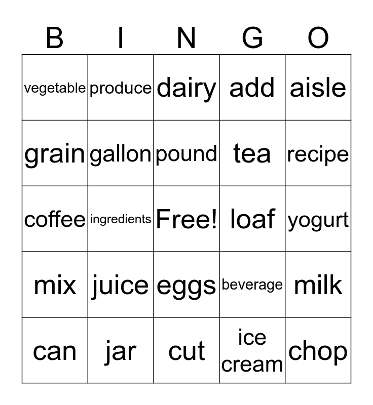 This bingo card has a free space and 24 words: juice, jar, pound, can, aisle, vegetable, grain, produce, loaf, eggs, tea, coffee, beverage, milk, gallon, ice cream, yogurt, dairy, recipe, ingredients, chop, mix, add and cut.