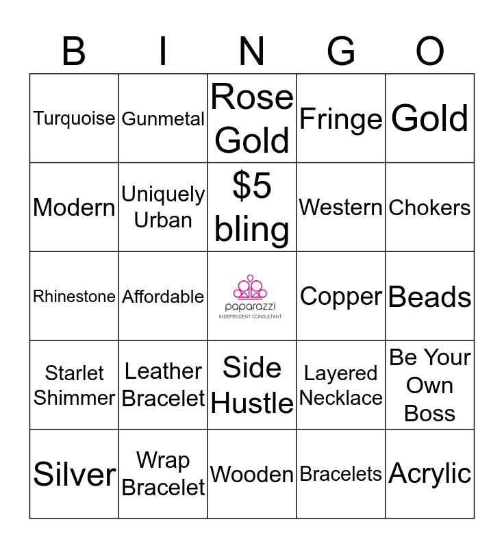 This bingo card has a free space and 34 words: Necklaces, Bracelets, Rings, Earrings, Starlet Shimmer, Uniquely Urban, Gold, Silver, Gunmetal, Hair clips, $5 bling, Rose Gold, Consultant, Bronze, Copper, Chokers, Wrap Bracelet, Rhinestone, Leather Bracelet, Layered Necklace, Side Hustle, Home Party, Turquoise, Beads, Wooden, Acrylic, Fringe, Feathers, Western, Modern, Chic, Affordable, Be Your Own Boss and Zi Collection.