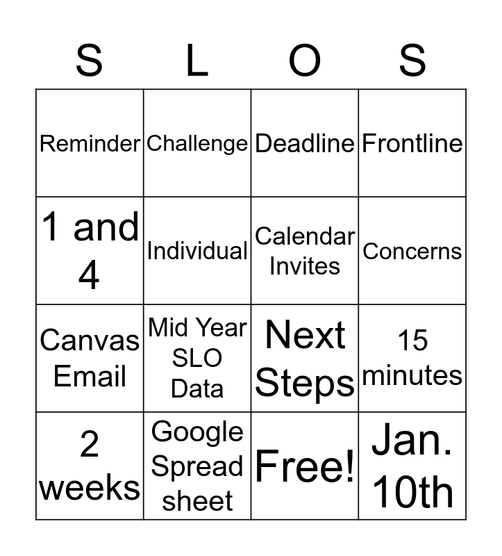 This bingo card has 16 words: 2 weeks, Google Spread sheet, Deadline, Frontline, 1 and 4, Challenge, Next Steps, 15 minutes, Reminder, Individual, Free!, Concerns, Canvas Email, Mid Year SLO Data, Calendar Invites and Jan. 10th.