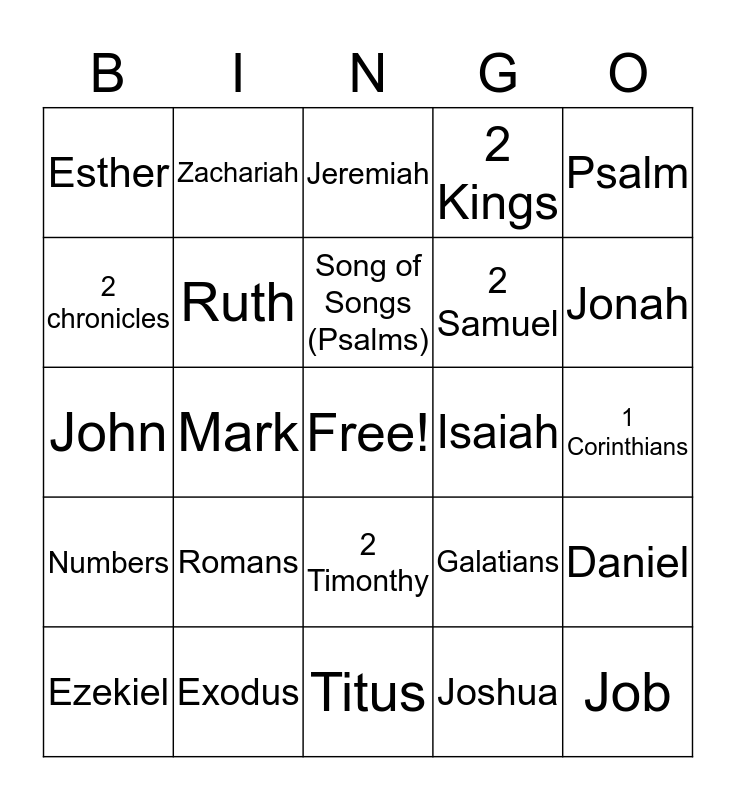 This bingo card has a free space and 61 words: Genesis, Exodus, Leviticus, Numbers, Joshua, Judges, Ruth, 1 Samuel, 2 Samuel, 1 Kings, 2 Kings, 1 Chronicles, 2 chronicles, Ezra, Nehemiah, Esther, Job, Psalm, Proverbs, Song of Songs (Psalms), Isaiah, Jeremiah, Ezekiel, Daniel, Hosea, Joel, Amos, ObadiaH, Jonah, Micah, Nahum, Habakkuk, Zephaniah, Haggai, Zachariah, Malachi, Matthew, Mark, Luke, John, Acts, Romans, 1 Corinthians, 2 Corinthians, Galatians, Ephesians, Philippians, Colossians, 1 Timothy, 2 Timonthy, Titus, Philemon, Hebrews, James, 1 Peter, 2 Peter, 1 John, 2 John, 3 John, Jude and Revelation.