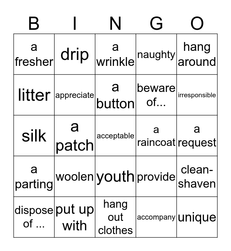 This bingo card has a free space and 24 words: woolen, put up with, a button, dispose of ..., hang around, a fresher, litter, drip, a raincoat, youth, beware of..., silk, provide, clean-shaven, appreciate, accompany, a request, a wrinkle, irresponsible, a patch, unique, a parting, naughty and hang out clothes.