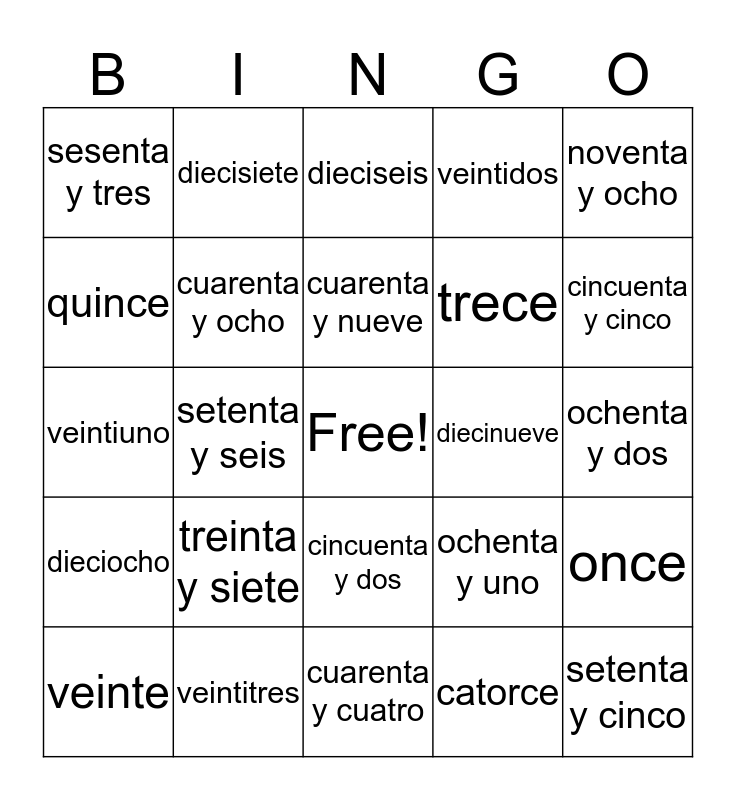 This bingo card has a free space and 28 words: once, doce, trece, catorce, quince, dieciseis, diecisiete, dieciocho, diecinueve, veinte, veintiuno, veintidos, veintitres, cuarenta y cuatro, cincuenta y cinco, treinta y seis, treinta y siete, cuarenta y ocho, cuarenta y nueve, cincuenta y dos, sesenta y tres, sesenta y cuatro, setenta y cinco, setenta y seis, ochenta y dos, ochenta y uno, noventa y ocho and noventa y siete.