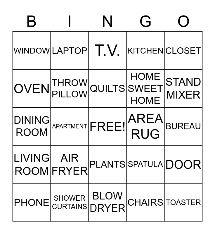 This bingo card has a free space and 69 words: COUCH, BUREAU, MICRO WAVE, INSTANT POT, SHOWER CURTAINS, BEDROOM, KITCHEN, VACUUM CLEANER, CLOSET, HALLWAY, DOOR, BOOK CASE, WINDOW, T.V., KEYS, APARTMENT, PLANTS, HOME SWEET HOME, CARPET, LIVING ROOM, AREA RUG, SPATULA, STAND MIXER, POTS, PANS, SOFA, REFRIGERATOR, DINING TABLE, CHAIRS, OTTOMAN, LAPTOP, HAMPER, LAMP, NIGHT-STAND, MATTRESS, TOILET, HANGERS, WASHING MACHINE, OVEN, KEURIG, AIR FRYER, TOASTER, TEAPOT, MUGS, VASE, PHONE, CANDLES, FAMILY, BLANKET, THROW PILLOW, QUILTS, PILLOWS, TRASH CAN, BLOW DRYER, VIDEO GAMES, BOOKS, SHOE RACK, PLUNGER, HAIR BRUSH, DINING ROOM, CURTAINS, BAKING SHEET, ROLLING PIN, TOOTH-BRUSH, TOWELS, DOORMAT, STORAGE BIN, MIRROR and BENCH.