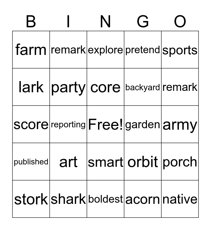 This bingo card has a free space and 24 words: art, shark, core, stork, sports, farm, lark, remark, garden, smart, backyard, score, orbit, porch, party, acorn, army, explore, remark, reporting, native, published, pretend and boldest.