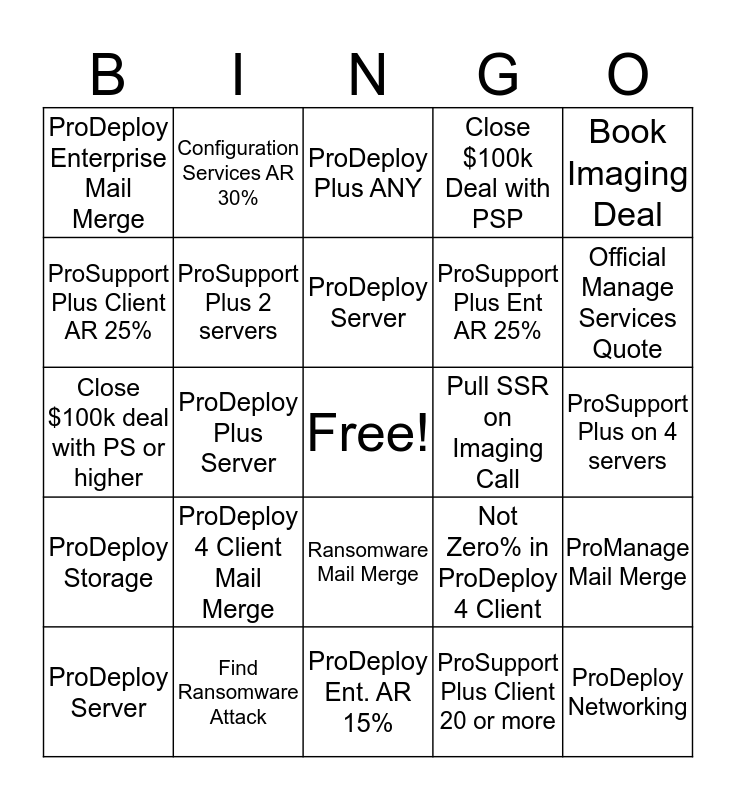 This bingo card has a free space and 24 words: ProDeploy Server, ProDeploy 4 Client Mail Merge, ProDeploy Server, ProSupport Plus Client 20 or more, Book Imaging Deal, ProDeploy Enterprise Mail Merge, Configuration Services AR 30%, ProDeploy Plus ANY, Pull SSR on Imaging Call, ProSupport Plus on 4 servers, Close $100k deal with PS or higher, ProSupport Plus 2 servers, Not Zero% in ProDeploy 4 Client, ProManage Mail Merge, ProSupport Plus Client AR 25%, Find Ransomware Attack, ProDeploy Ent. AR 15%, Close $100k Deal with PSP, Official Manage Services Quote, ProDeploy Storage, ProDeploy Plus Server, Ransomware Mail Merge, ProSupport Plus Ent AR 25% and ProDeploy Networking.