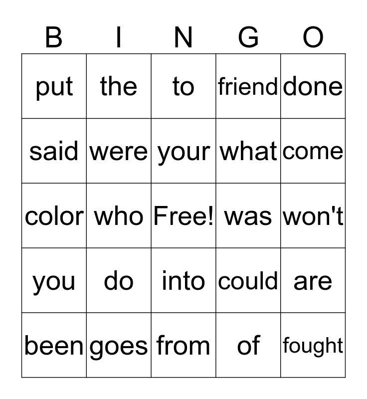 This bingo card has a free space and 28 words: are, two, what, of, said, to, the, you, was, been, color, friend, goes, from, come, there, do, were, your, into, put, want, fought, who, won't, could, done and where.
