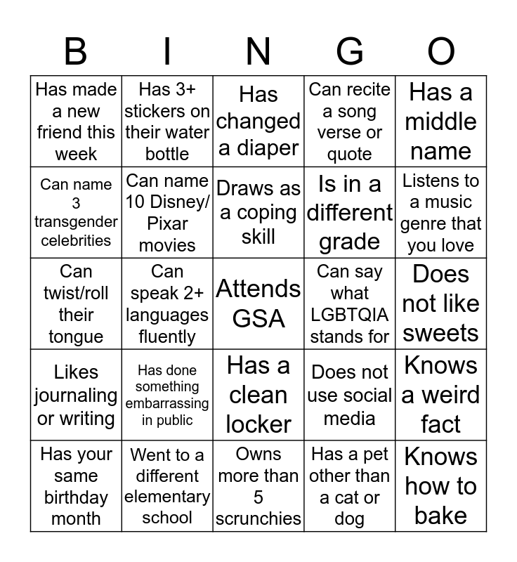This bingo card has a free space and 34 words: Was not born in Wisconsin, Has visited another state other than MN, Loves to make DIY crafts, Plays a sport, Does not like sweets, Can name 3 transgender celebrities, Can name 10 Disney/ Pixar movies, Owns more than 5 scrunchies, Is in a different grade, Knows how to bake, Can twist/roll their tongue, Has 3+ stickers on their water bottle, Has a pet other than a cat or dog, Can name 5 people from "That 70's Show", Likes journaling or writing, Can speak 2+ languages fluently, Has a clean locker, Can say what LGBTQIA stands for, Knows a weird fact, Has your same birthday month, Went to a different elementary school, Has same # of siblings as you, Can recite a song verse or quote, Listens to a music genre that you love, Can do 3 Fortnite dance moves, Has done something embarrassing in public, Has changed a diaper, Gets up before 6 am, Has a middle name, Has made a new friend this week, Read a book that turned into a movie, Draws as a coping skill, Does not use social media and Knows a "Dad Joke".