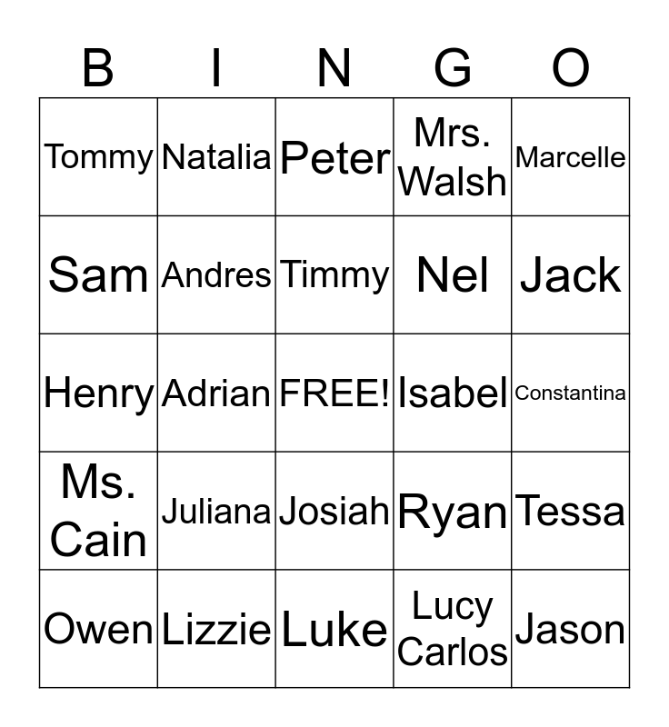This bingo card has a free space and 24 words: Juliana, Lizzie, Timmy, Owen, Marcelle, Tommy, Sam, Natalia, Isabel, Josiah, Nel, Henry, Ryan, Tessa, Andres, Lucy Carlos, Constantina, Peter, Jack, Adrian, Jason, Ms. Cain, Mrs. Walsh and Luke.