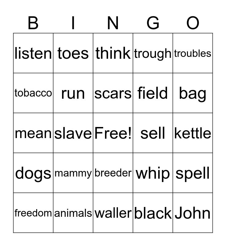 This bingo card has a free space and 26 words: Springhouse, mammy, waller, black, bag, listen, toes, think, field, spell, mean, slave, whip, John, dogs, Sarny, scars, sell, troubles, freedom, run, breeder, trough, kettle, tobacco and animals.