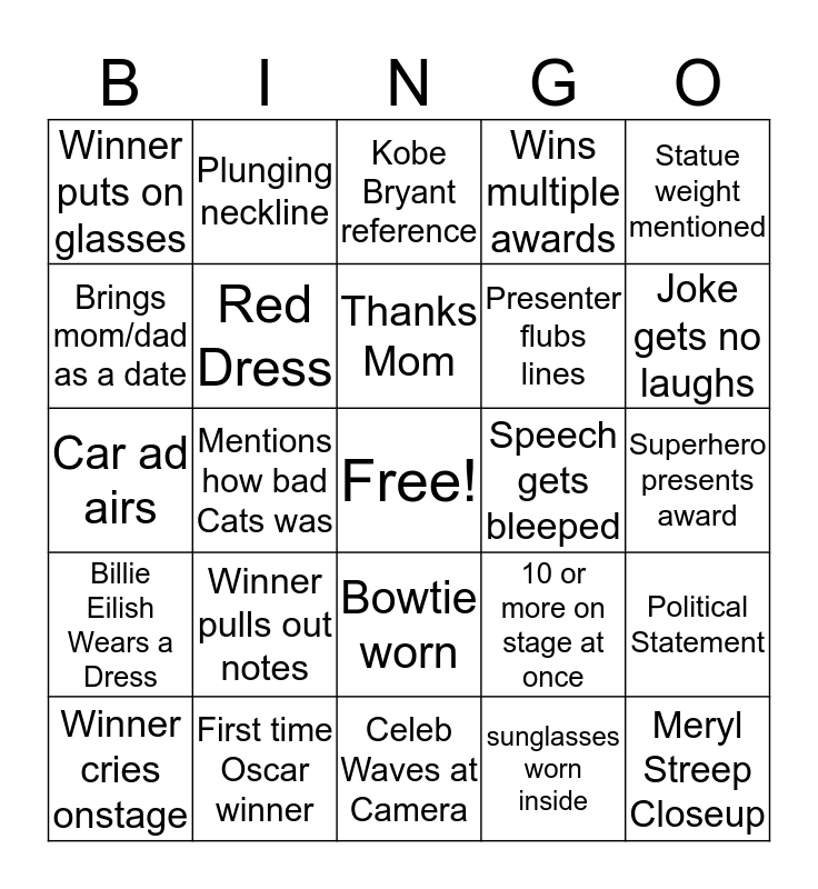 This bingo card has a free space and 24 words: Winner pulls out notes, First time Oscar winner, Thanks Mom, Winner cries onstage, Statue weight mentioned, Winner puts on glasses, Brings mom/dad as a date, Plunging neckline, Speech gets bleeped, Bowtie worn, Presenter flubs lines, Car ad airs, 10 or more on stage at once, Political Statement, Red Dress, sunglasses worn inside, Superhero presents award, Kobe Bryant reference, Joke gets no laughs, Mentions how bad Cats was, Meryl Streep Closeup, Billie Eilish Wears a Dress, Wins multiple awards and Celeb Waves at Camera.