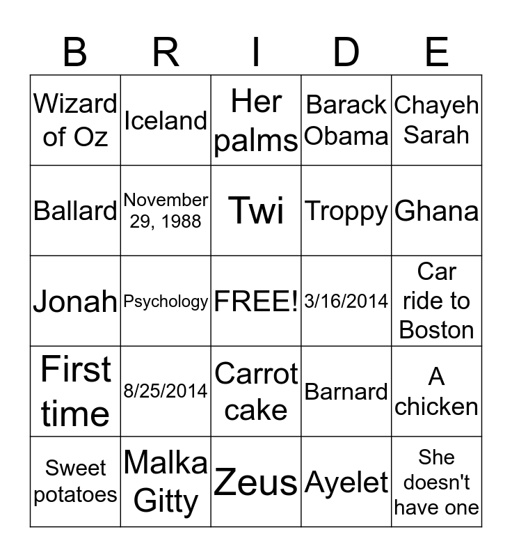 This bingo card has a free space and 39 words: Ethiopia, 1st Grade, Harlem Link, November 29, 1988, Sweet potatoes, Carrot cake, Twi, My Heart Will Go On, Chayeh Sarah, First time, Psychology, Barack Obama, She doesn't have one, Car ride to Boston, 3/16/2014, 8/25/2014, Gann Academy, Wizard of Oz, Girl Ghana Wild, Barnard, Ballard, Zeus, Troppy, Ghana, Whistle, Newton, Washington Heights, Gabi, Ayelet, Iceland, Dismantled settlement in Sinai, Cross country motorcycle ride, Her palms, Malka Gitty, Ayelet, Lexi, A chicken, Jonah and Bat Mitzvah Trip.