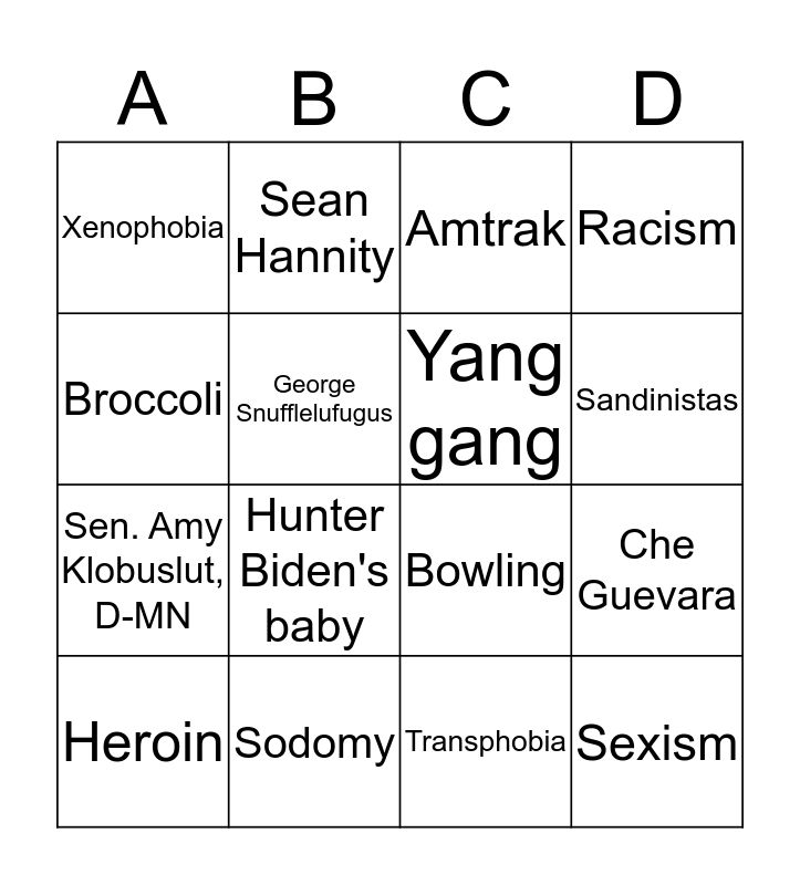 This bingo card has 16 words: Sodomy, Che Guevara, Amtrak, Xenophobia, Sen. Amy Klobuslut, D-MN, Sean Hannity, Bowling, Transphobia, Broccoli, George Snufflelufugus, Heroin, Racism, Hunter Biden's baby, Sandinistas, Yang gang and Sexism.