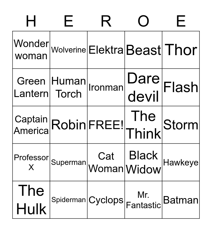 This bingo card has a free space and 24 words: Superman, Spiderman, Ironman, The Hulk, Thor, Wonder woman, Green Lantern, Wolverine, The Think, Cat Woman, Dare devil, Captain America, Black Widow, Hawkeye, Human Torch, Mr. Fantastic, Storm, Elektra, Flash, Robin, Batman, Professor X, Beast and Cyclops.