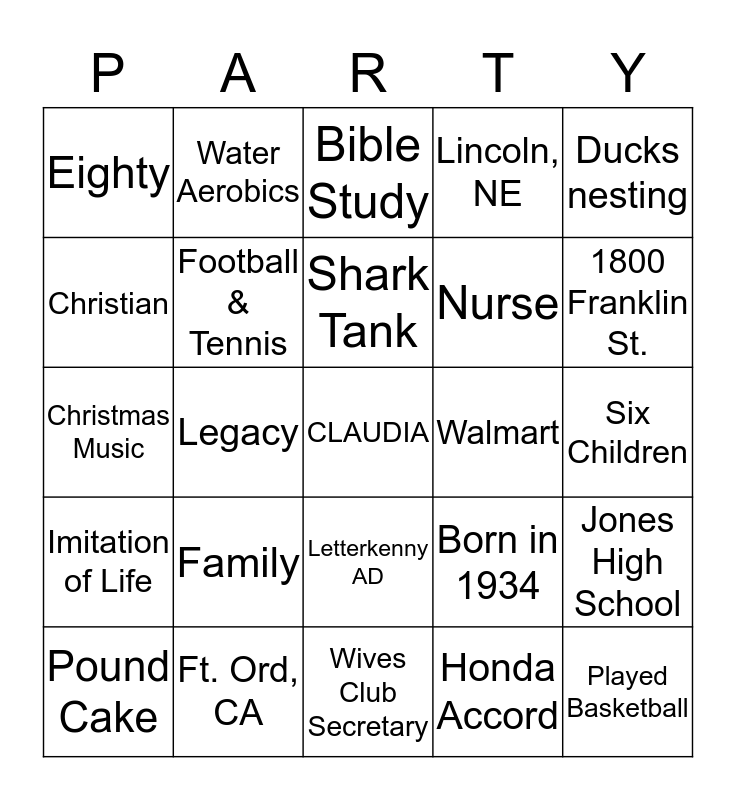 This bingo card has a free space and 27 words: Born in 1934, Galion, LA, Nurse, Wives Club Secretary, Christian, Bible Study, Water Aerobics, Imitation of Life, Walmart, Jones High School, Christmas Music, Lincoln, NE, Pound Cake, Ft. Ord, CA, 1800 Franklin St., Judge Judy, Football & Tennis, Shark Tank, Family, Eighty, Six Children, Honda Accord, Legacy, Played Basketball, Letterkenny AD, Ducks nesting and Quilting.