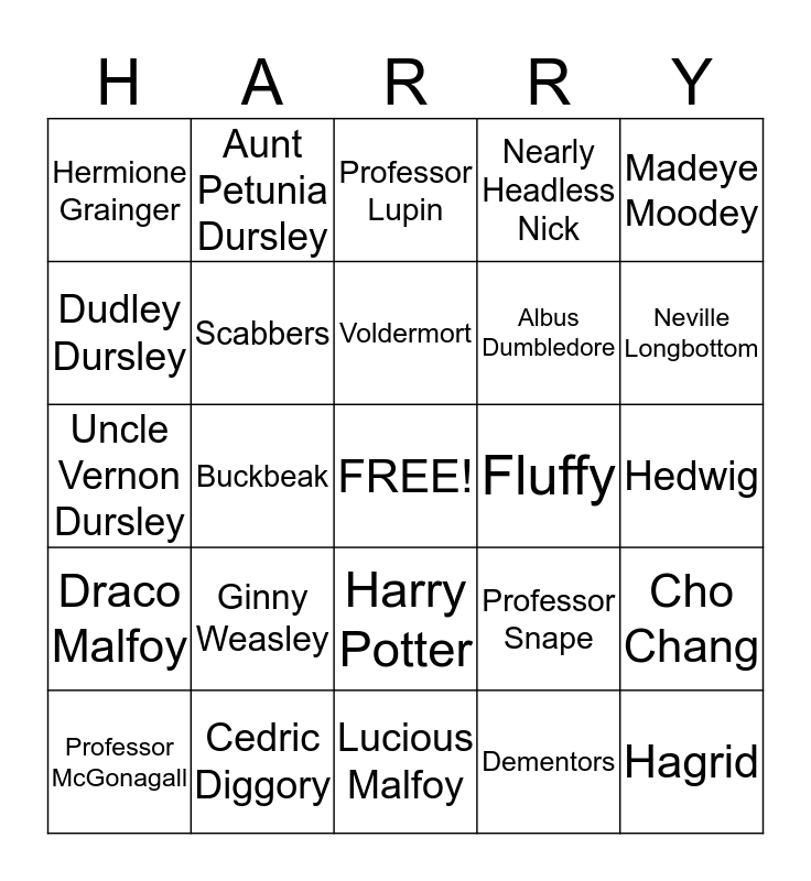 This bingo card has a free space and 24 words: Ginny Weasley, Cedric Diggory, Voldermort, Professor McGonagall, Madeye Moodey, Hermione Grainger, Dudley Dursley, Aunt Petunia Dursley, Fluffy, Harry Potter, Albus Dumbledore, Uncle Vernon Dursley, Professor Snape, Cho Chang, Scabbers, Dementors, Hedwig, Professor Lupin, Neville Longbottom, Buckbeak, Hagrid, Draco Malfoy, Nearly Headless Nick and Lucious Malfoy.