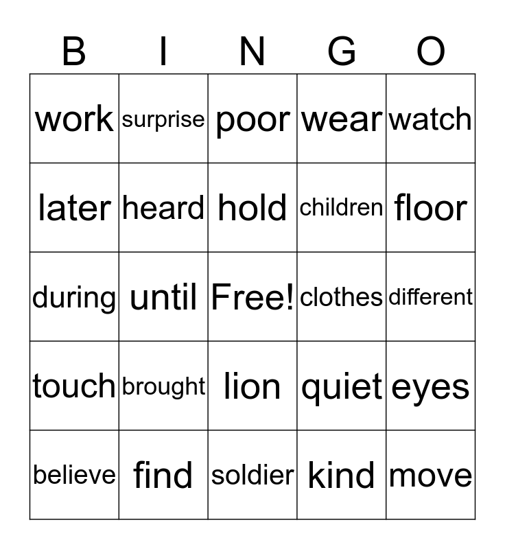 This bingo card has a free space and 41 words: shoes, during, kitchen, heard, find, lion, hold, winter, watch, touch, until, wear, move, different, clothes, brought, guess, work, order, poor, eyes, school, soldier, children, very, story, kind, behind, floor, idea, straight, surprise, believe, right, quiet, later, whole, girl, lady, reason and beautiful.