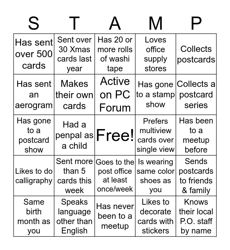 This bingo card has a free space and 29 words: Same birth month as you, Traveled outside US last year, Had a penpal as a child, Collects stamps, Has sent over 500 cards, Has 20 or more rolls of washi tape, Makes their own cards, Sent more than 5 cards this week, Prefers multiview cards over single view, Speaks language other than English, Has been to a meetup before, Knows their local P.O. staff by name, Has never been to a meetup, Likes to decorate cards with stickers, Collects a postcard series, Has their own name stamp, Goes to the post office at least once/week, Likes to do calligraphy, Collects postcards, Has gone to a postcard show, Is wearing same color shoes as you, Is a librarian, Has gone to a stamp show, Has sent an aerogram, Loves office supply stores, Sent over 30 Xmas cards last year, Sends postcards to friends & family, Active on PC Forum and Has a FB or IG just for postcards.