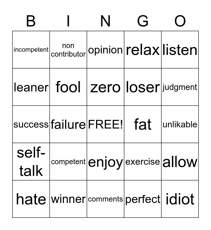 This bingo card has a free space and 24 words: competent, winner, zero, hate, listen, incompetent, leaner, non contributor, fat, enjoy, loser, success, exercise, allow, fool, perfect, unlikable, opinion, judgment, failure, idiot, self-talk, relax and comments.