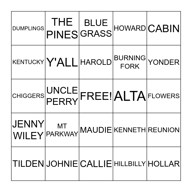 This bingo card has a free space and 30 words: JOHNIE, MAGOFFIN, UNCLE PERRY, MAZIE, DUMPLINGS, BLUE GRASS, Y'ALL, MAUDIE, ALTA, CALLIE, FLOWERS, HOLLAR, HILLBILLY, FIRED CHICKEN, YONDER, MOON SHINE, KENNETH, JENNY WILEY, MT PARKWAY, CABIN, CHIGGERS, LUCY, THE PINES, BURNING FORK, KENTUCKY, HOWARD, REUNION, TILDEN, HAROLD and LICKING.