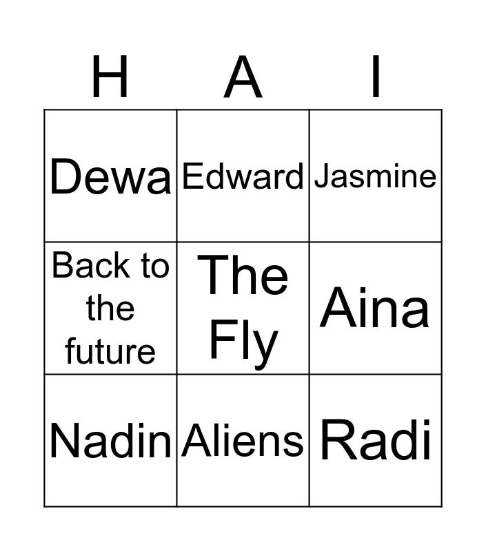 This bingo card has a free space and 8 words: Aina, Jasmine, Edward, Nadin, Dewa, Radi, Back to the future and Aliens.